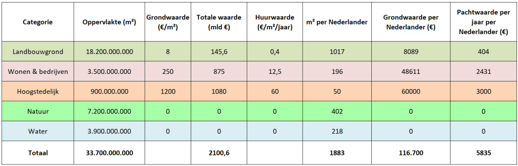 Om een beter beeld te krijgen hoe een wereld met gelijke rechten op de aarde eruit zou kunnen zien, hebben we wat cijfermateriaal verzameld voor de Nederlandse situatie. Hoewel dit slechts een grove schatting is, lijken de cijfers niet onrealistisch. Je kunt bijvoorbeeld opzoeken wat een perceel bouwgrond kost. En je kunt opzoeken wat de prijs of de pachtwaarde van een ha landbouwgrond is.