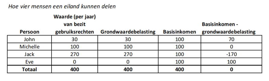 Als de opbrengsten van de grondwaardebelasting gelijk verdeeld worden, resulteert dit in een basisinkomen van 100 voor elke persoon. De laatste kolom toont het resultaat als we de effecten van de grondwaardebelasting en het basisinkomen bij elkaar optellen.